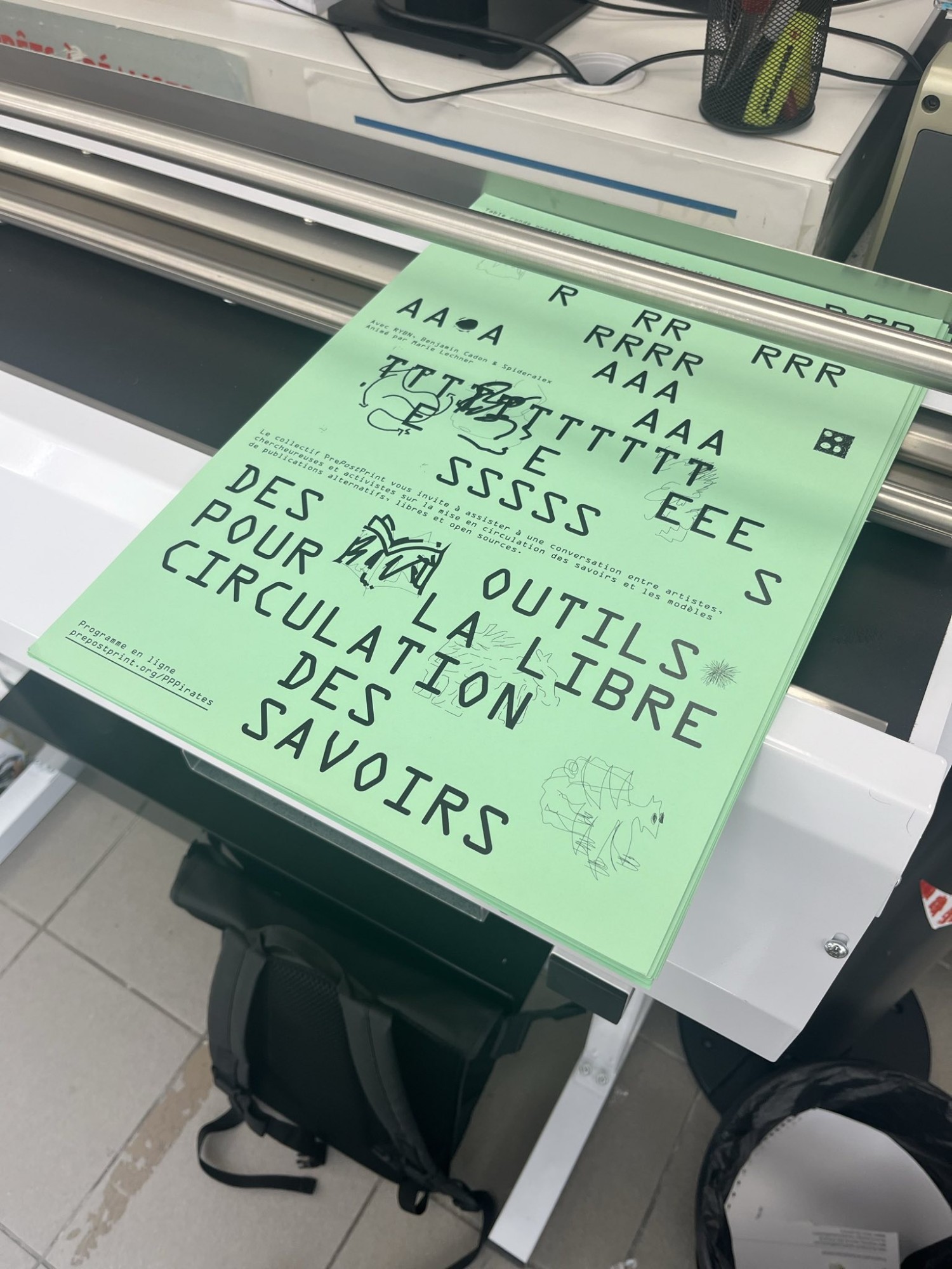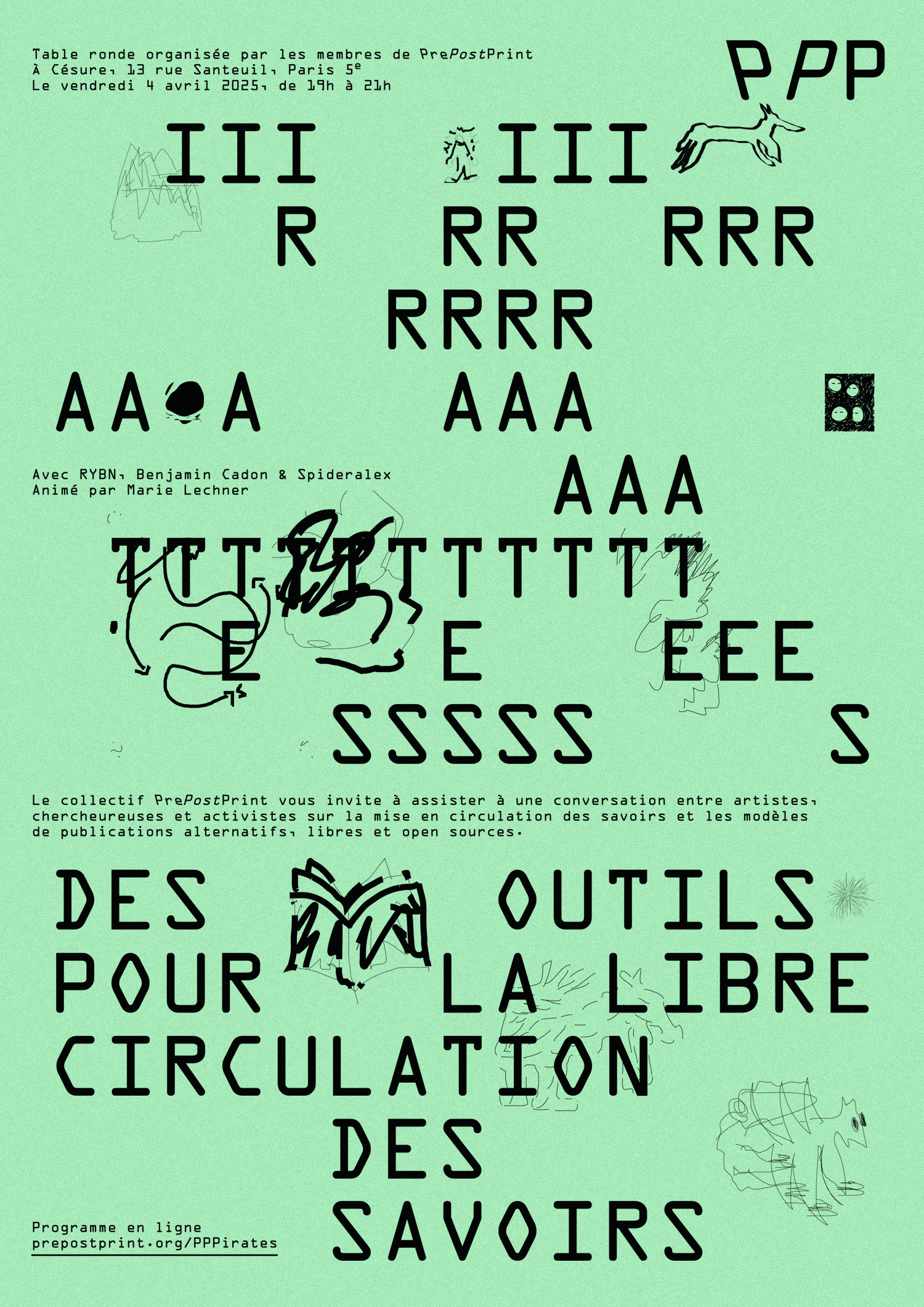 Avec le collectif PrePostPrint – qui rassemble des designereuses, développeureuses ou bricoleureuses interéssé·es par la question du logiciel libre dans les pratiques éditoriales – nous avons organisé une table ronde qui portait sur la piraterie comme voie de diffusion des savoirs. Nous avons réalisé l'affiche de l'évènement en CSS to print et à quatre mains avec Julia Veljkovic.